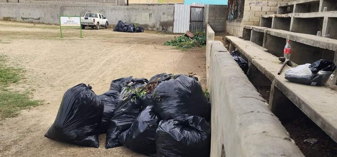 Brigadas de limpieza de ambas instituciones ayuntamiento y DIGECAc, procedieron a limpiar, podar y recoger todos los desperdicios que se encontraban en el pley viejo.